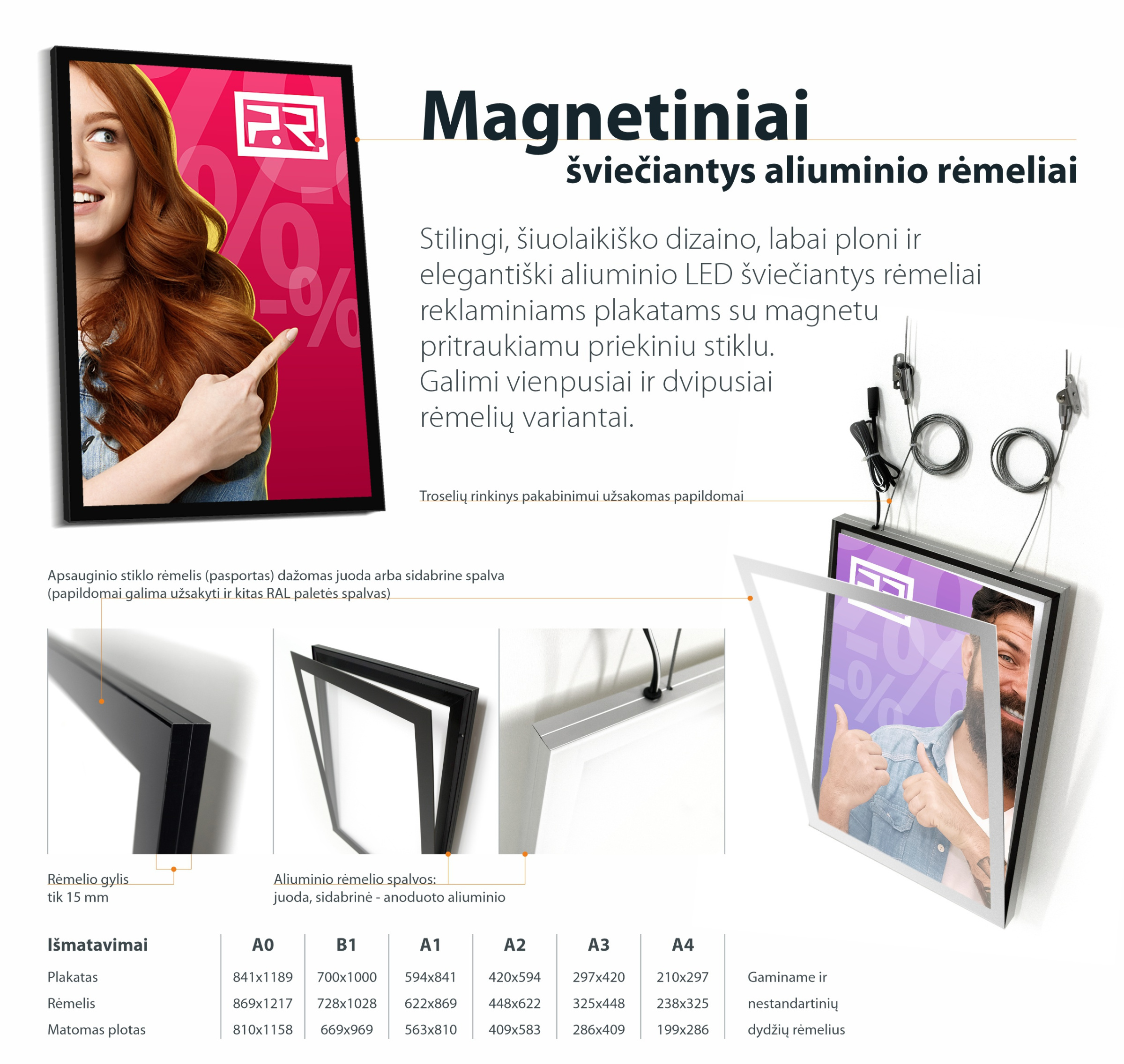 Perduoti informaciją, vizualiai patraukliai pateikti savo reklaminę žinutę ir būti pastebėtam potencialių klientų yra bet kokio sėkmingo verslo tikslas. Anoduotų aliuminio profilių reklaminiai rėmeliai – praktiškas pasirinkimas reklamuoti įmonę, prekes, pateikti informaciją apie prekių kainas ir akcijas. Lengvi, elegantiški, modernios išvaizdos rėmeliai tinka bet kokiam verslui, jie papuošia parduotuvės vitrinas ir stilingai dekoruoja biuro interjerą. Siūlome standartinių formatų plakatams skirtus magnetinius bei CLICK sistemos rėmelius, vienpusius ir dvipusius, nešviečiančius ir šviečiančius. Rėmeliai tiekiami kartu su apsauginiu antirefleksiniu plastiku, apsaugančiu reklaminį plakatą nuo dulkių, drėgmės ar išblukimo. Galimi rėmelių variantai skirti tiek vidaus, tiek lauko sąlygoms.